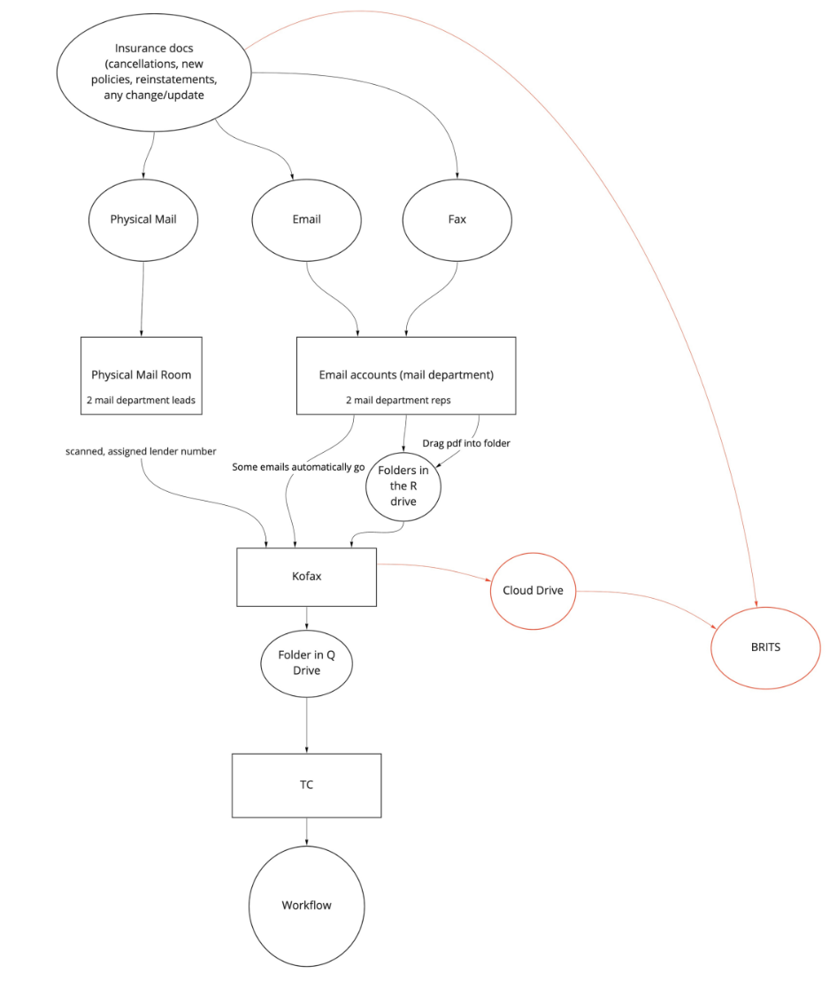 Flow Diagram of the Mail Room, with red indicating on opportunity to simplify workflow with BRITS