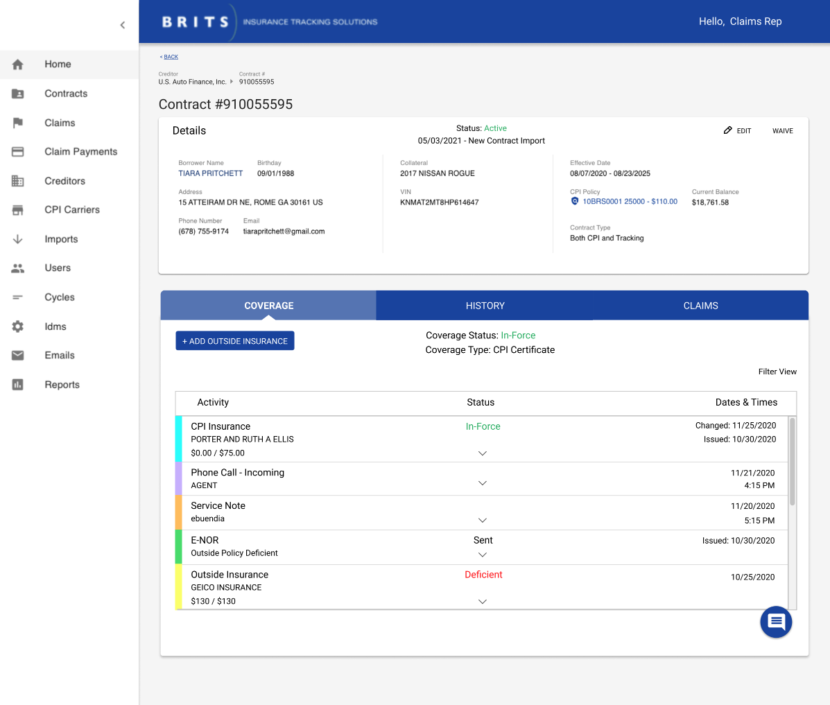 Berkshire Risk Services acts as a broker between financial institution clients (Creditors) that loan vehicles and insurance companies that offer Collateral Protection Insurance (CPI Carriers). With many moving parts and changing client accounts, Berkshire’s main products offered to clients are providing CPI insurance policies, customer support, and data management/tracking. To do these tasks, Berkshire is building their own in-house cloud-based software called BRITS to streamline internal task flows, automate data tracking, and provide clients the ability to file claims and view their clients’ (Borrowers’) data.